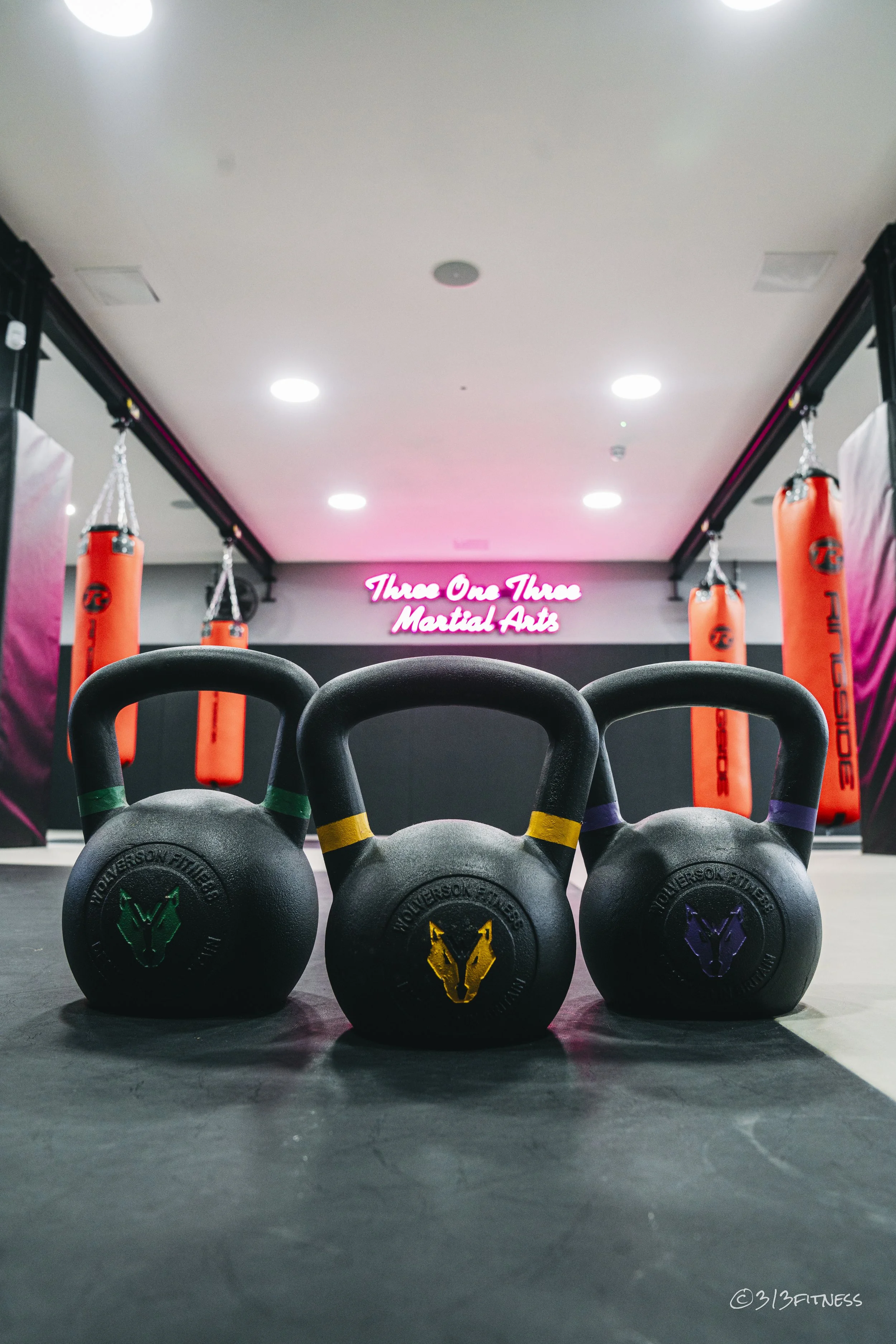 Three kettlebells with colored bands in front of a martial arts gym with red punching bags and a neon sign reading 'Three One Three Martial Arts'.